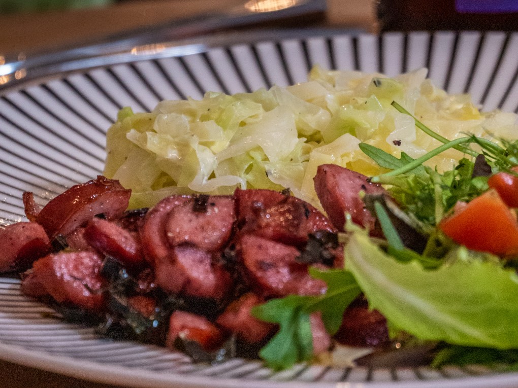 Gräddstuvad vitkål med knaperstekt viltkorv