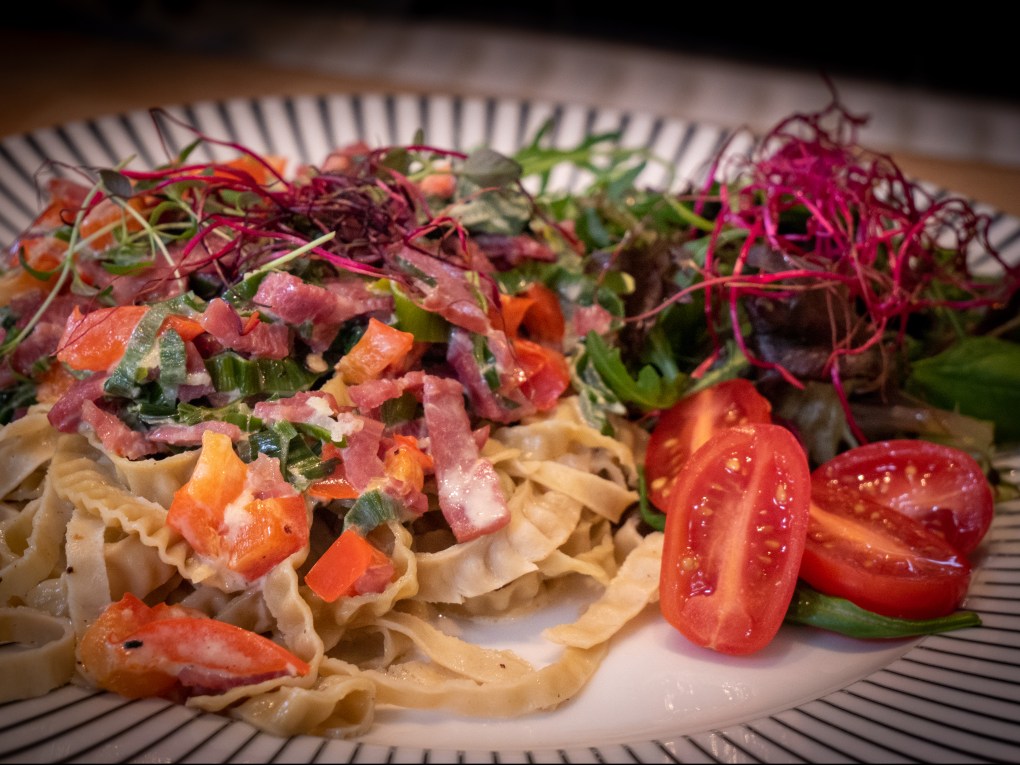 Bönpasta Carbonara på Elins vis med kalkonbacon